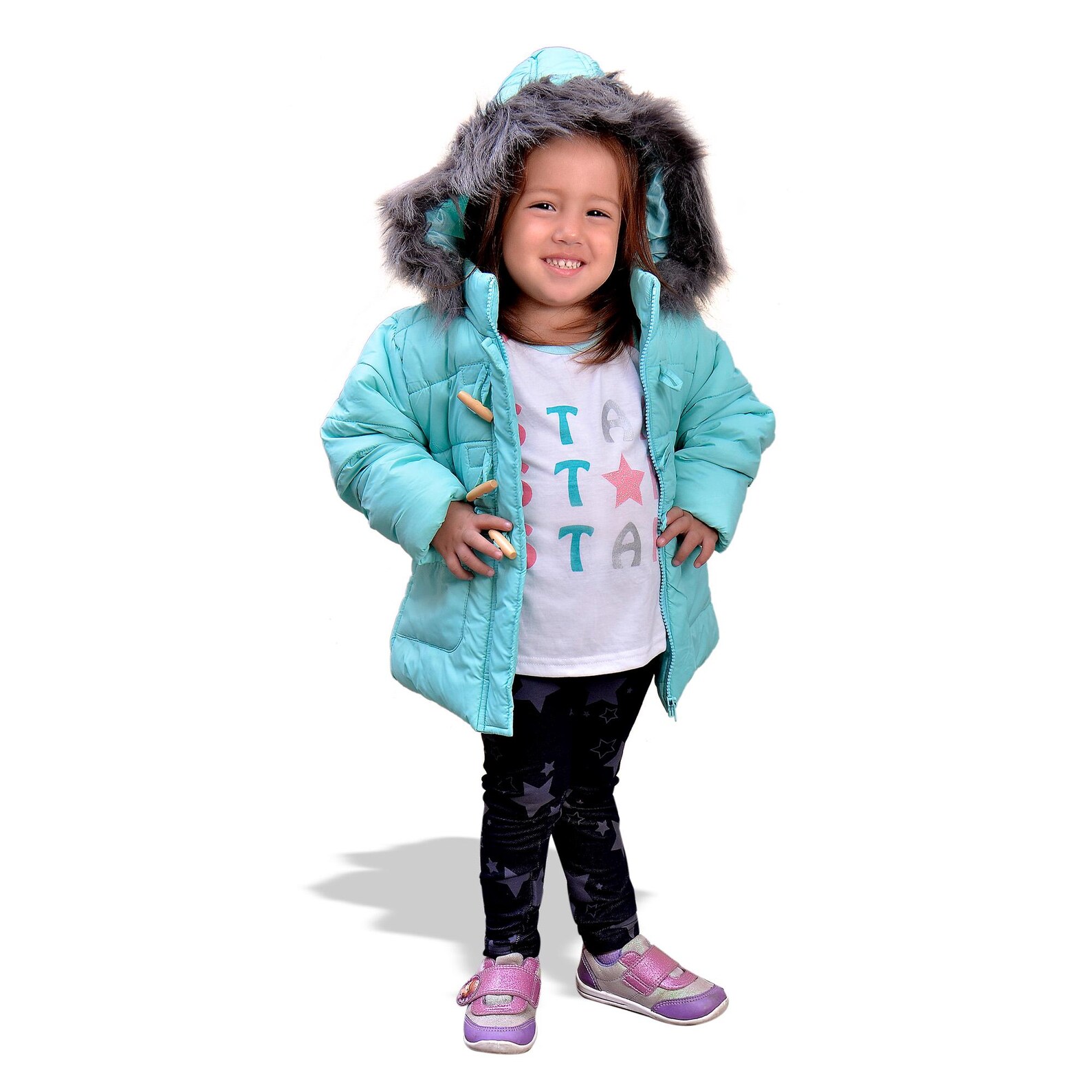 Keep your little girl warm, comfy, and stylish with this IKKI 3-piece girls’ outfit, perfect for chilly days and casual outings. Includes a mint green padded jacket, a long-sleeve printed T-shirt, and star-print leggings — the perfect mix of warmth and fun style.