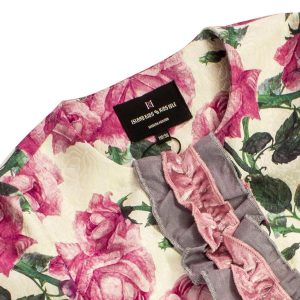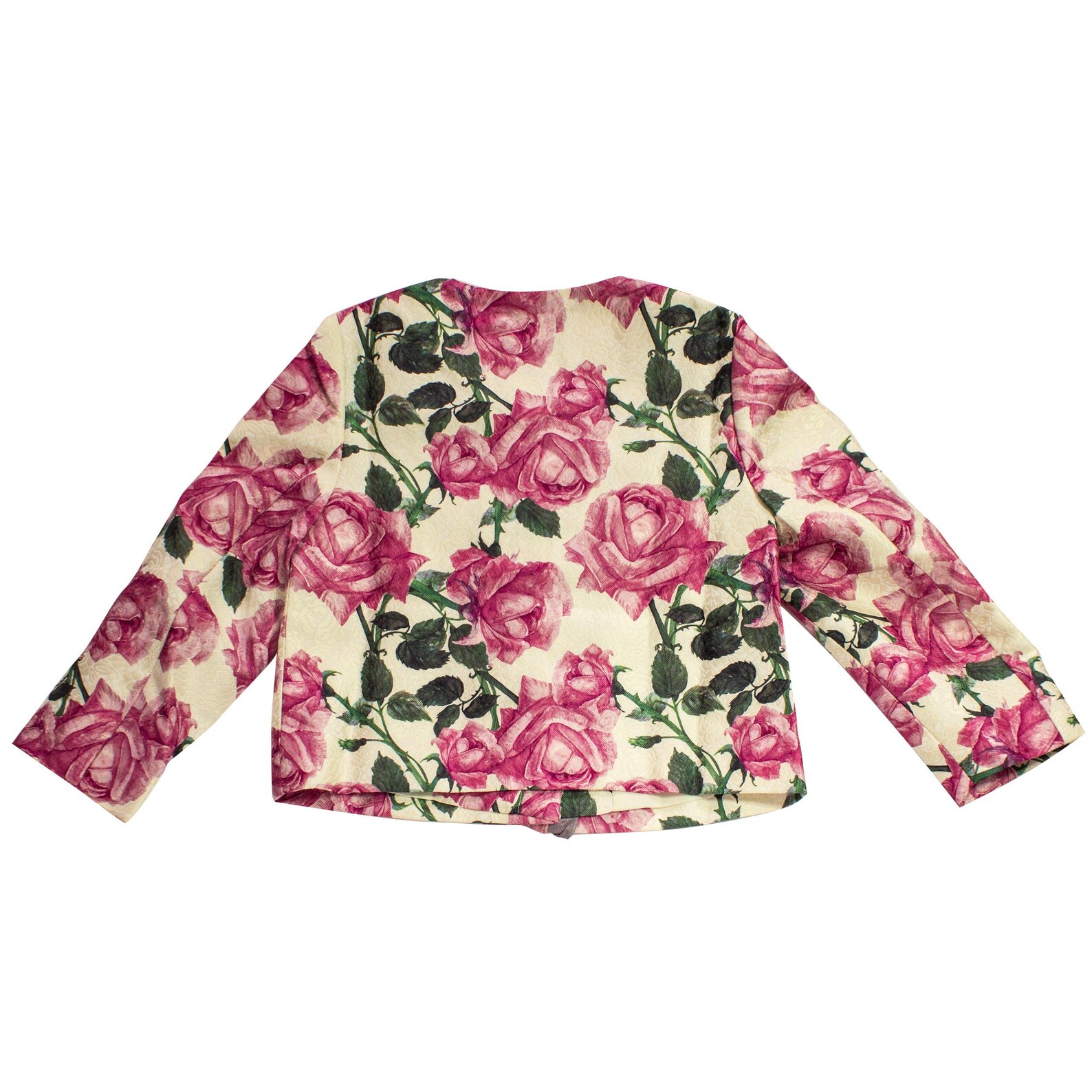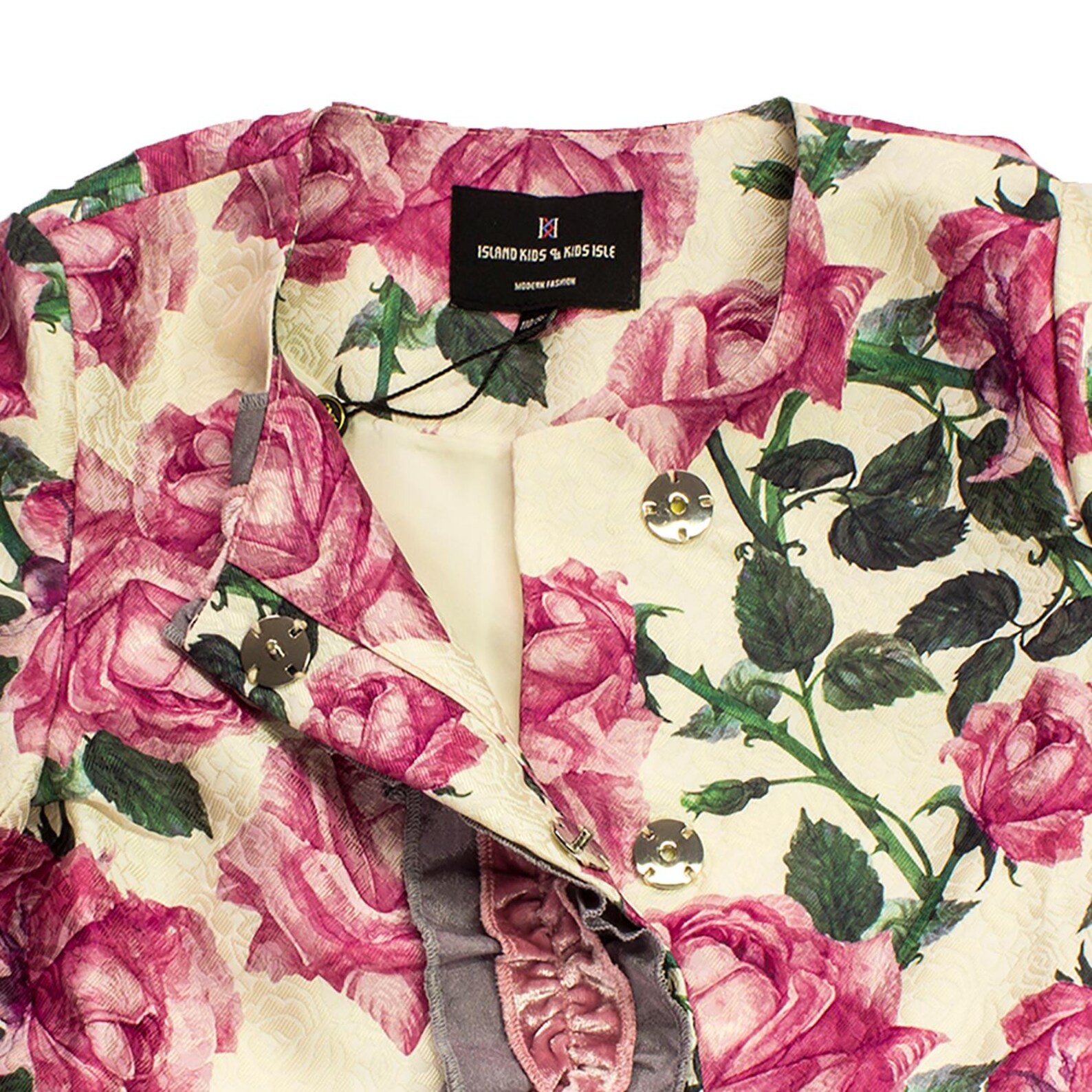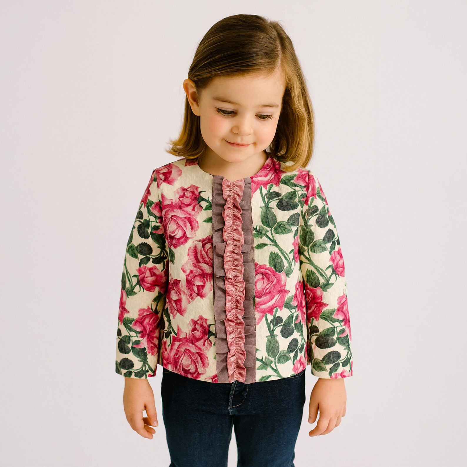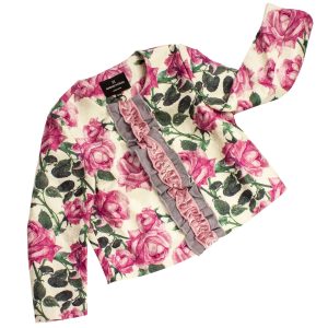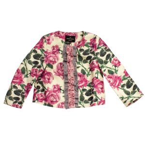 Dale un toque de elegancia y encanto al armario de tu pequeña con esta preciosa chaqueta floral. Diseñada con un delicado estampado de rosas en tonos rosados y suaves hojas verdes, es perfecta para ocasiones especiales o para darle un toque chic a tus conjuntos de diario.